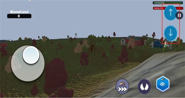 3、双击游戏右下角的翅膀按钮即可实现飞行,借助游戏右上角的上下按钮能够调整飞行高度,飞行过程中会持续消耗体力。