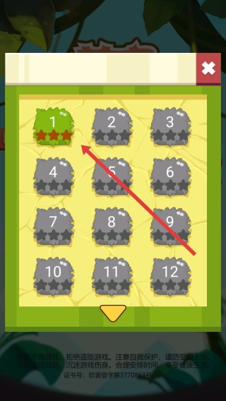 在关卡选择界面,点击箭头所指的“1”号关卡,开启首次冒险之旅,操控可爱的萌龙进行射击,达成闯关要求。
