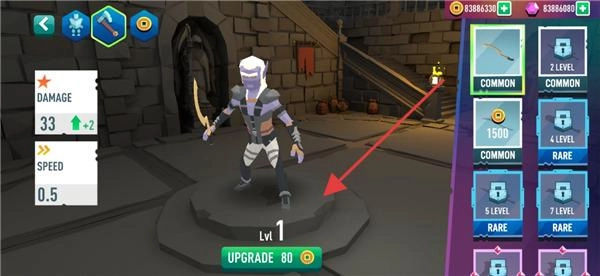 2、角色升级界面会呈现角色的各项属性,玩家可消耗80金币为角色提升等级;界面右侧设有武器栏,通过该栏可强化角色的战斗能力,以此展现游戏的养成系统。