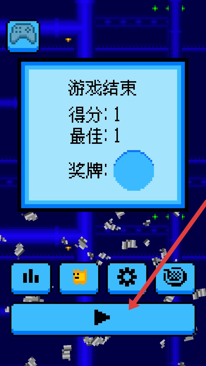 游戏结束后,界面会呈现当前得分与历史最佳记录,点击底部蓝色的【播放按钮】,就能重新开启挑战,向着更高成绩发起冲击。