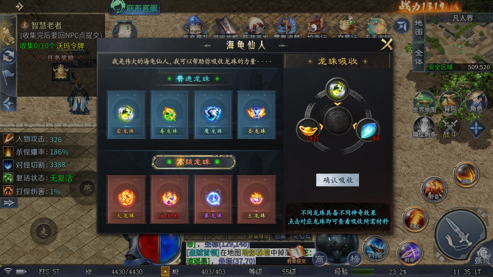 2、龙珠:每颗龙珠都有其独特的神奇效果,点击对应的龙珠就能看到吸收它所需的材料,在凡人界的NPC那里就可以完成吸收操作。