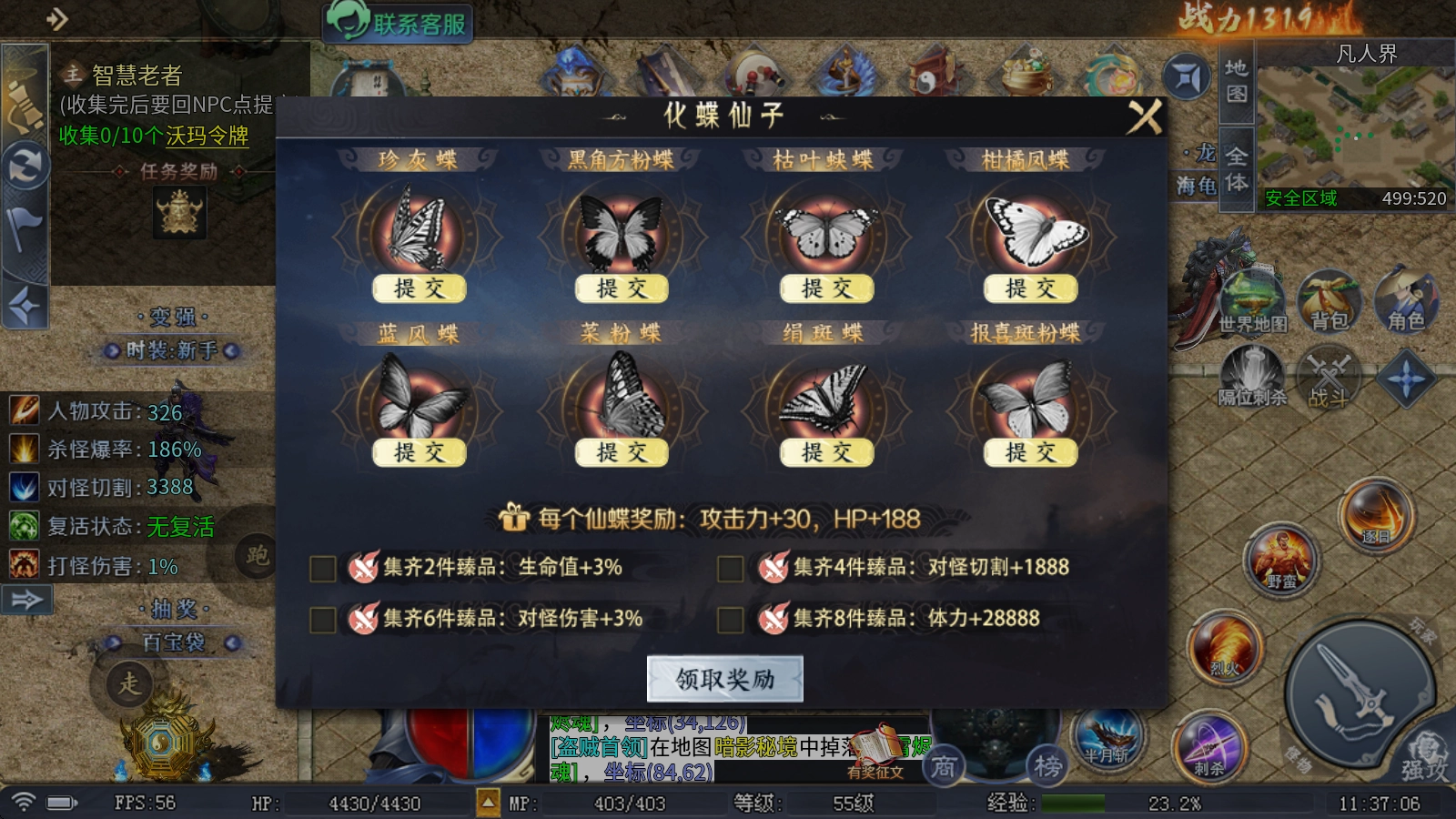 4、化蝶仙子:收集仙蝶并提交就能得到攻击力与血量的加成,每激活2件、4件、6件、8件时还会触发额外属性。