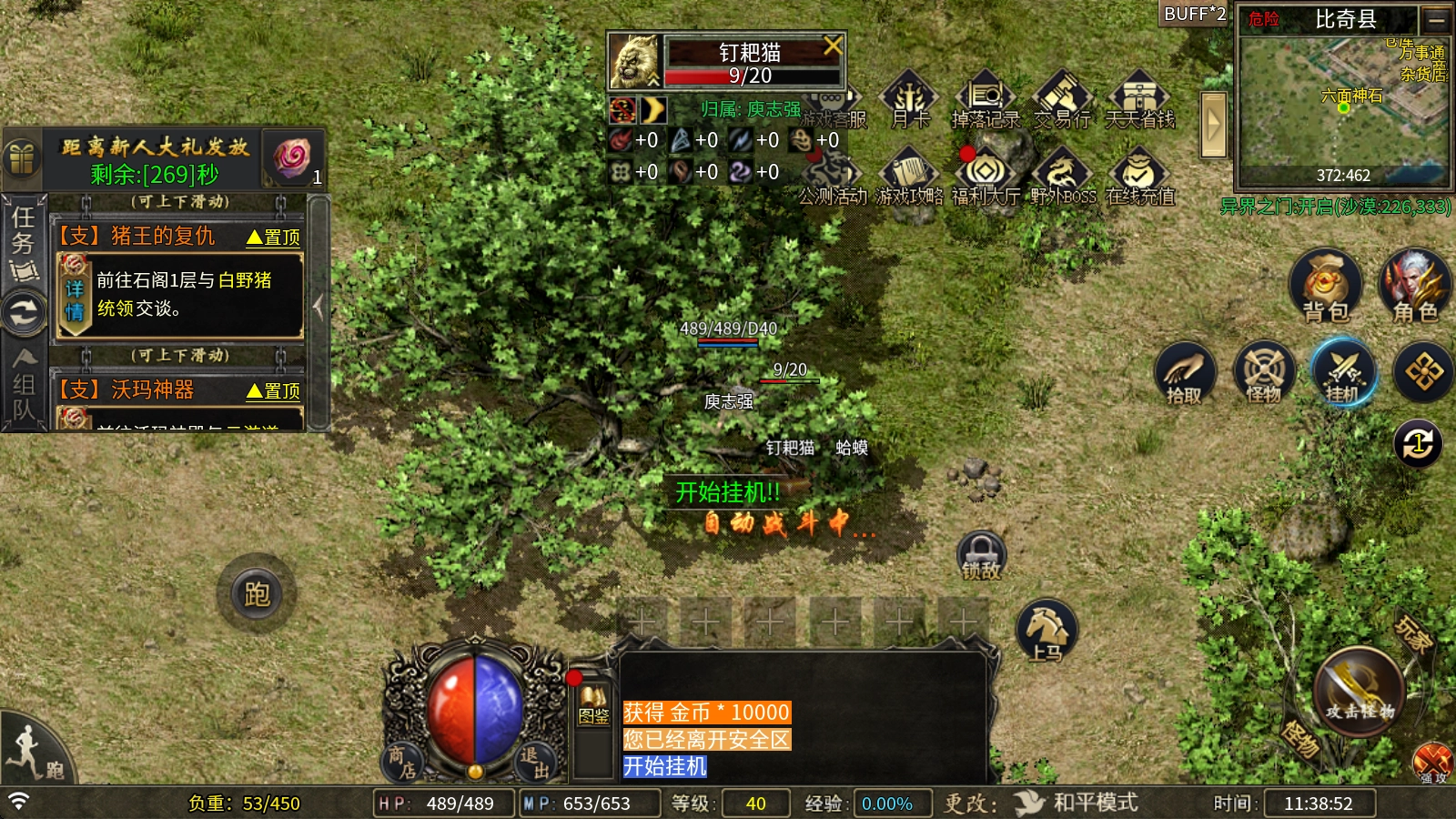 4、接着前往比奇商店的NPC那里瞧瞧,看看有没有可以捡漏的装备在出售,把装备搭配一下,尽可能将自身的主属性提升到40点上下。