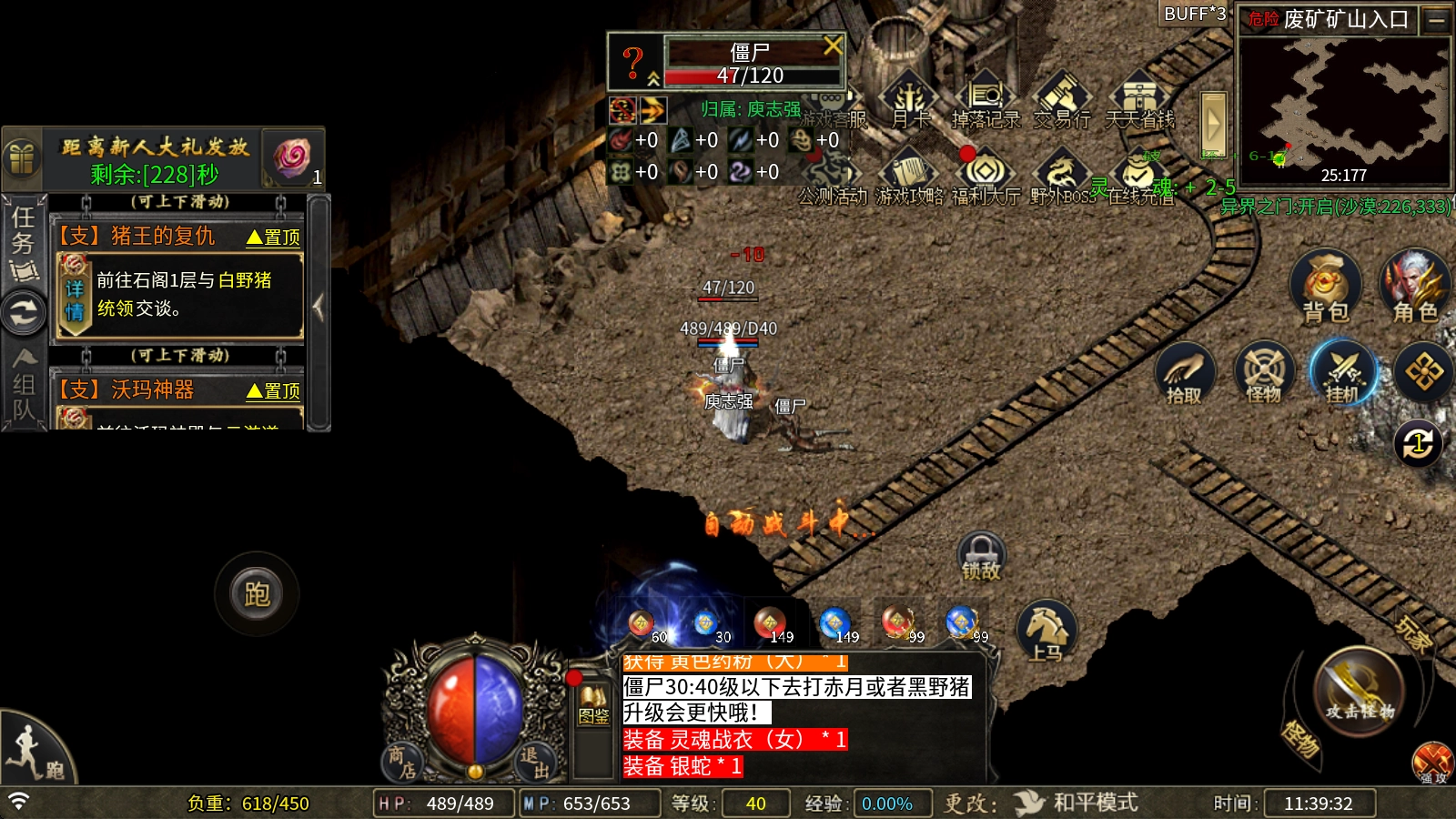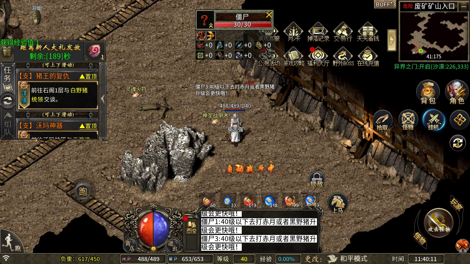 1、等你在僵尸洞把技能练得差不多,装备也凑齐了,等级达到31级的时候,就可以离开僵尸洞了。