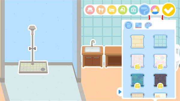 1、走进一间房子,点击右侧上方的图标,里面陈列着各式各样的家具,像床、沙发之类的,别忘了去布置摆放。
