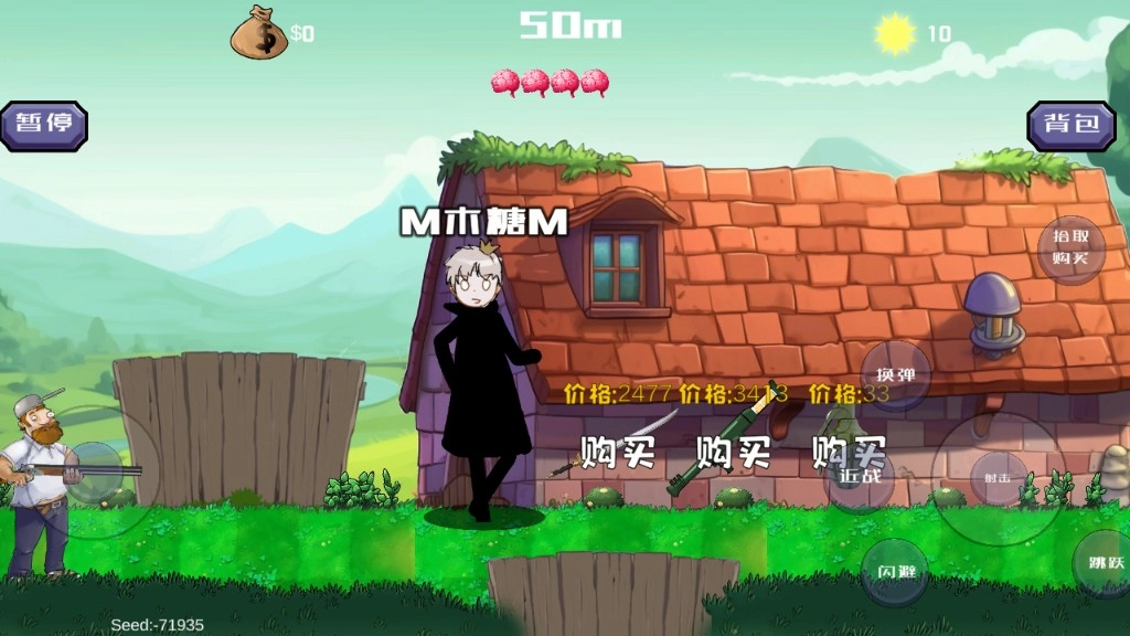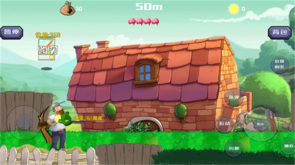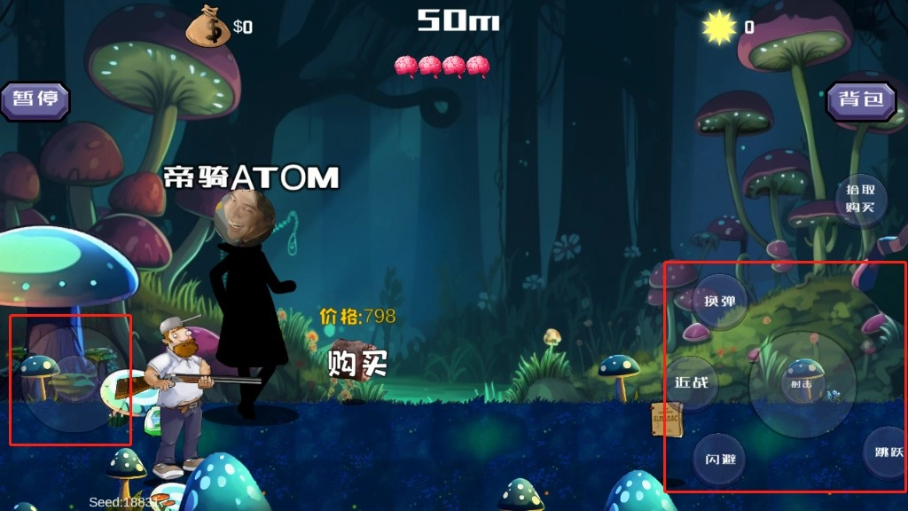 2、左侧控制角色移动,右侧负责攻击僵尸;中间上方类似脑子的图标代表角色生命值,一旦全部被僵尸啃食殆尽,游戏便会结束。