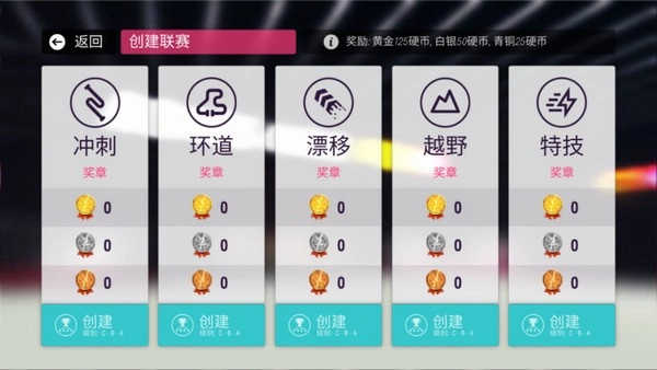 5、点击“创建联赛”选项,即可选择冲刺、环岛、漂移、越野、特技等多种模式