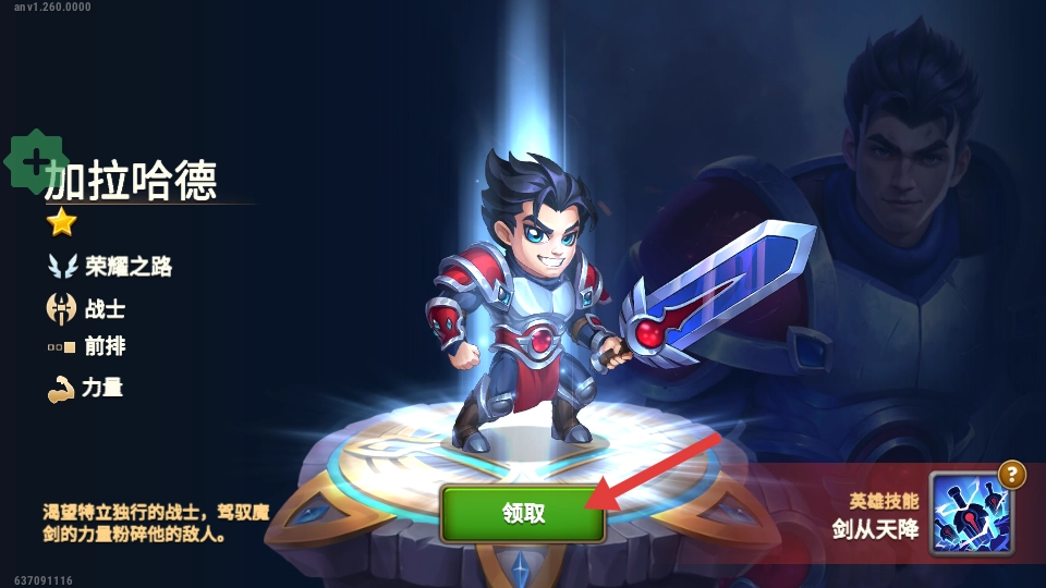 4、点击【领取】按钮获取英雄,借助该英雄的技能来增强战斗能力,从而继续推进冒险进程。
