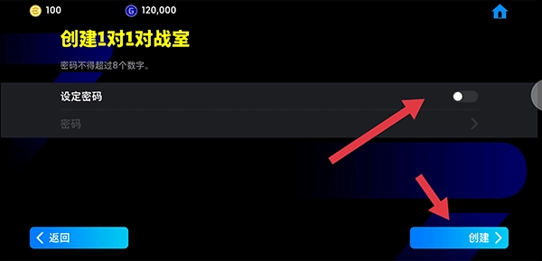5、如果玩家想要创建对战室,可点击创建1对1对战室,设置密码后点击创建即可;当然,玩家也可以选择不创建对战室。