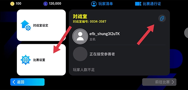 6、房间创建完成后,把右上角的对战室编号告知好友让他们加入,在等待好友加入的过程中,你可以点击比赛设置选项。
