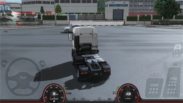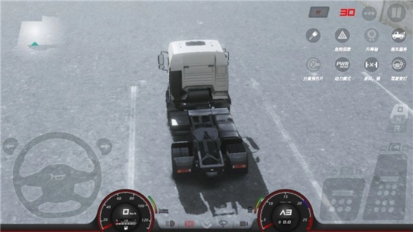 2、点击右上角的菜单按钮,接着点击左侧的钥匙图标来启动卡车,之后就可以通过踏板进行操作了。操作时以方向盘为坐标基准,右侧分布着刹车和油门踏板,而油门踏板的上方则是前进挡和倒挡的切换区域。