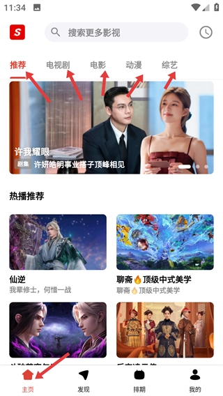 1、在主页有推荐,电视剧等分类还有热播推荐内容,可直接挑选感兴趣的影视观看也能通过搜索栏查找。