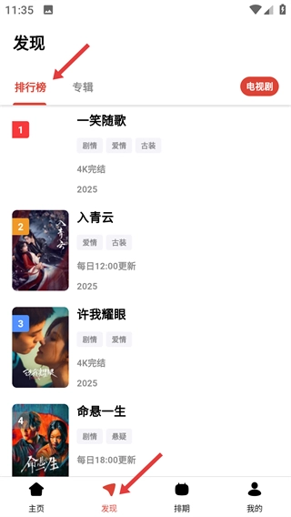 3、在发现页面有排行榜和专辑板块通过排行榜可了解热门影视,挑选想看的作品也可查看专辑内容。