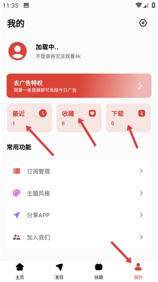 4、点击我的可查看最近观看,收藏和的影视,还有订阅管理等常用功能方便管理个人影视相关内容。