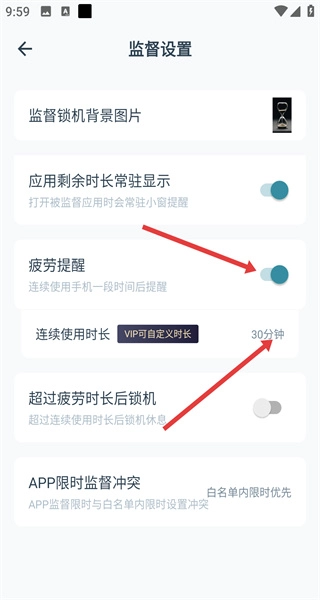 3、在监督设置页面,找到疲劳提醒选项,点击其右侧的开关按钮将其开启。
