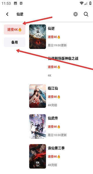 3、搜索仙逆后结果显示相关影视作品,还有备用源可根据需求选择对应版本,切换备用源进入详情页观影。