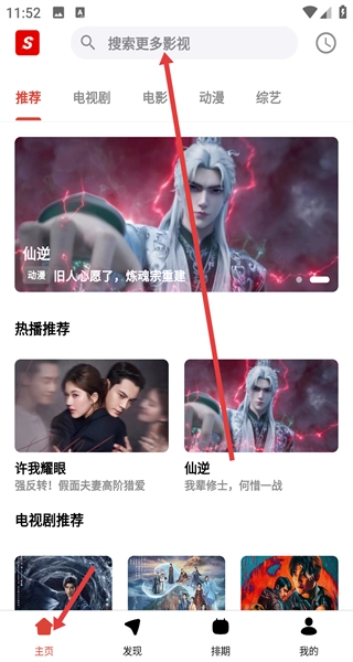 1、在主页顶部搜索栏可搜更多影视,推荐区浏览热门如仙逆和许我耀眼,分类涵盖电视剧和电影以及综艺等。