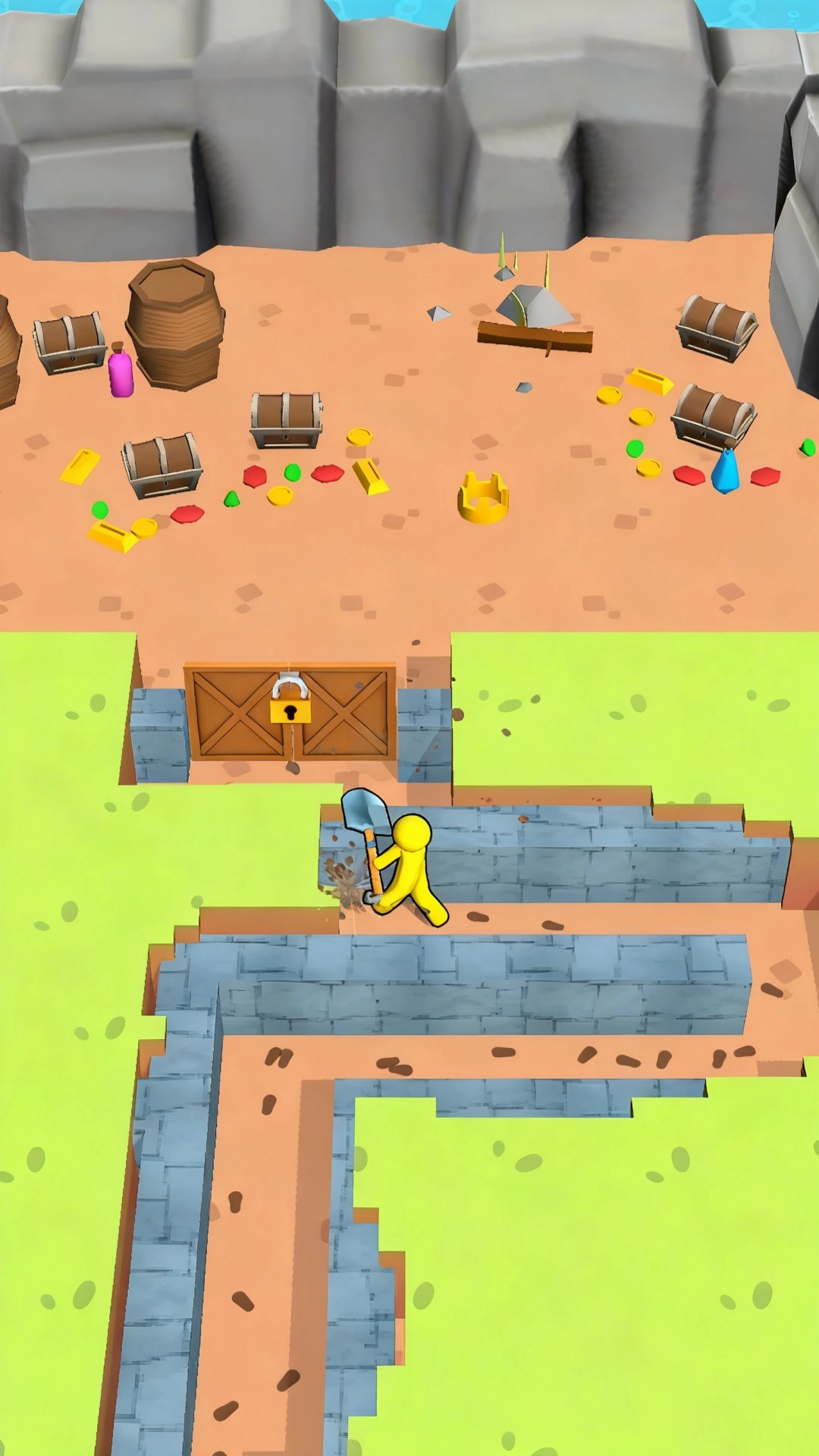 1.通过点击或滑动的方式操作铲子等工具,小心地挖掘土层、清除障碍,从而打通前进的路径。