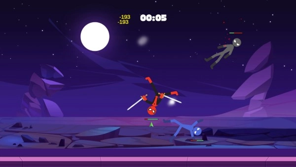 1、玩家通过虚拟摇杆控制火柴人移动走位,点击按键发动攻击或长按蓄力释放强力技能。
