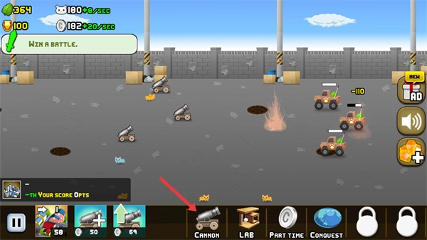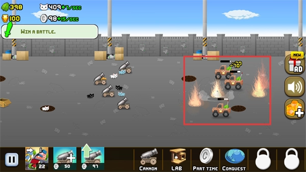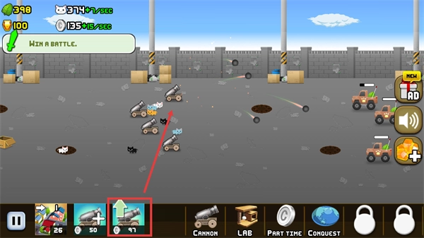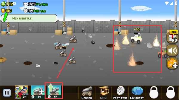 2、战斗中升级【大炮】提升火力,增强对敌方【白色车辆】的打击效果,加快战斗节奏。