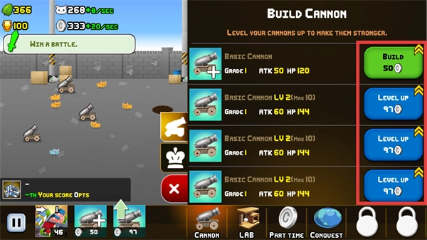 3、在升级界面,消耗资源建造新的加农炮,或升级已有加农炮(花费970金币),提升攻击力与生命值。