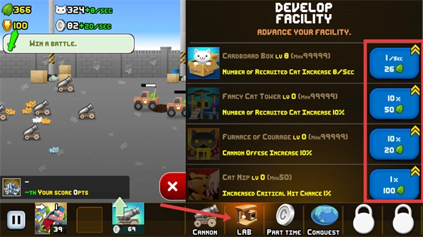 4、切换到【DEVELOP-FACILITY】界面,升级设施提升猫咪招募速度,增强防御阵容的持续作战能力。
