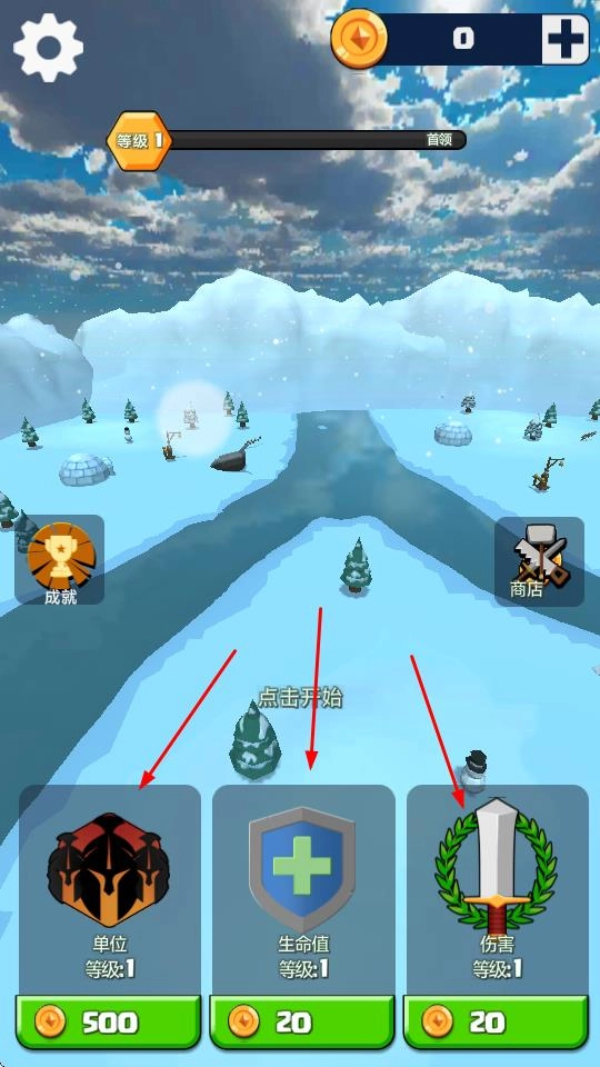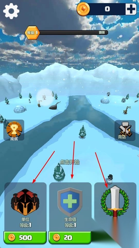 1、在关卡准备界面,可消耗金币对“单位、生命值、伤害”这些属性进行升级,以此强化防御与攻击能力,为接下来抵御敌人的进攻做好战前提升。
