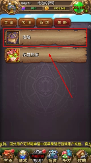 1、找到界面底部的【攻略】按钮并点击,进入攻略页面后可查看【英雄热度】相关信息,为后续了解玩法做准备。