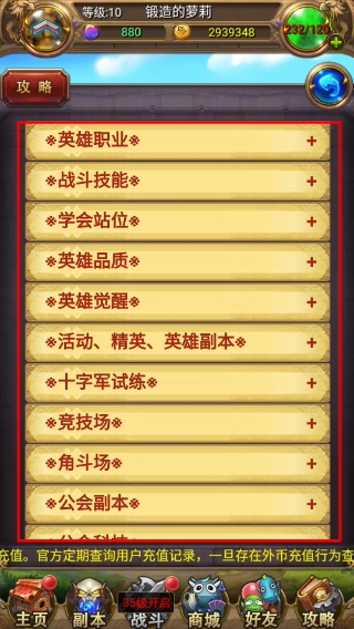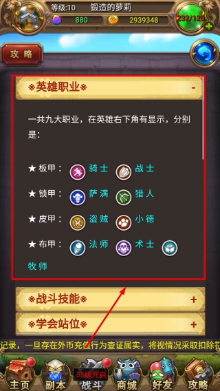 2、进入攻略页面后,可见【英雄职业】【战斗技能】等多个分类选项,按需点击对应选项查看详细内容。