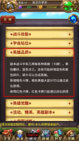 4、查看【英雄品质】分类内容,了解副本掉落的【紫色】-【蓝色】等卡牌品质,及碎片合成进化规则。