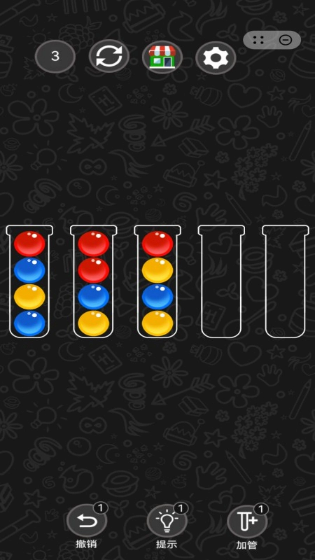 2. 每个关卡会提供数个装有不同颜色混合小球的瓶子,以及少量空瓶作为操作空间。