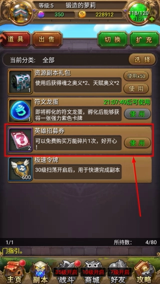 3、在道具栏中找到【英雄招募券】,点击对应的使用按钮,就能免费兑换万能碎片,以此加快英雄的养成进度。