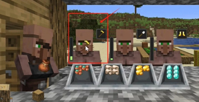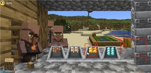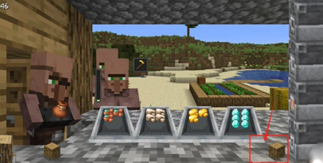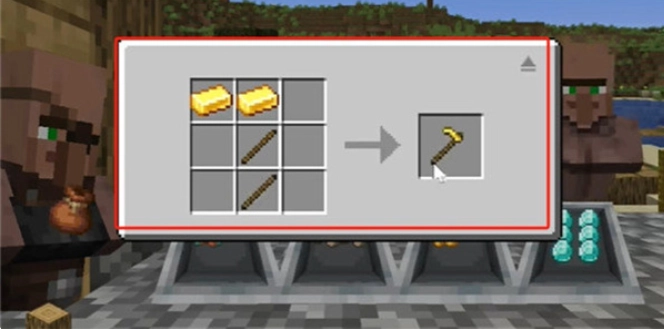 11、把从炼金台获得的两个金块放入台成台,再把两根木棍放进来,合成一个金锄头。
