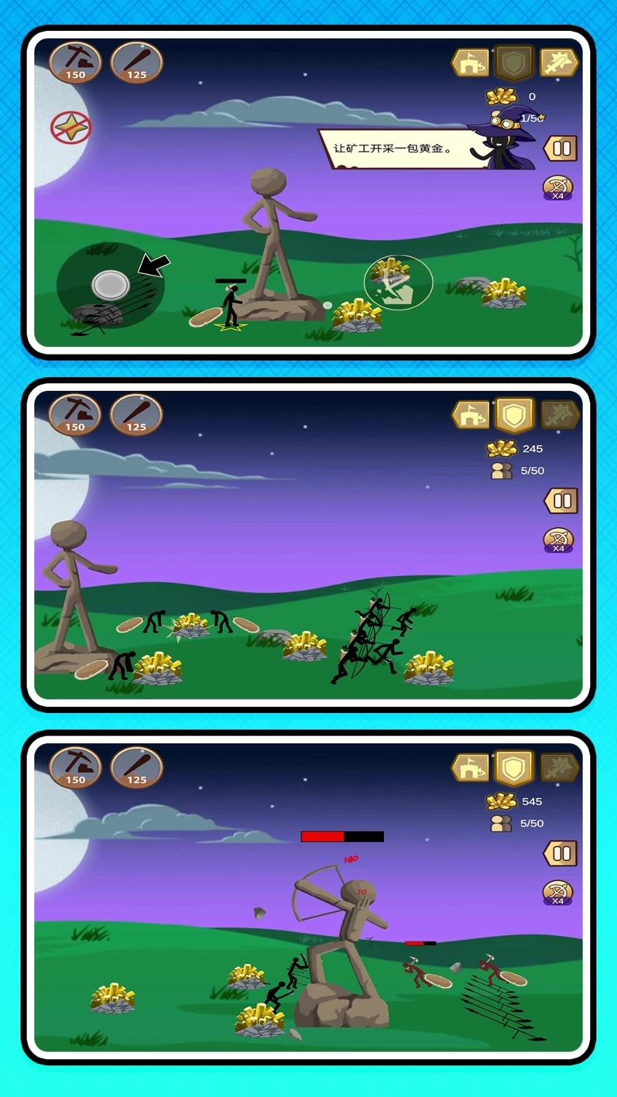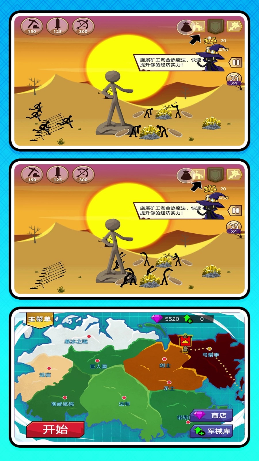 3、在战争初期要训练矿工,让矿工快速挖矿,玩家要使用金矿来召唤不同种类的士兵。