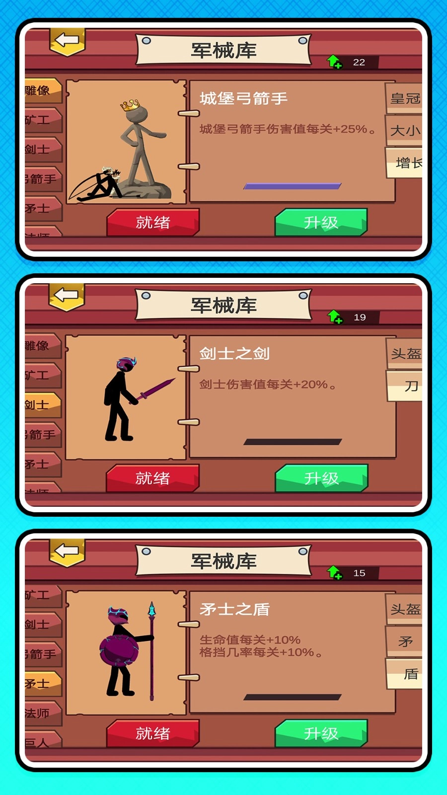 3、消耗战斗获取的资源,对火柴人士兵进行训练升级,提升士兵基础属性与技能效果,让战队整体战力逐步增强。