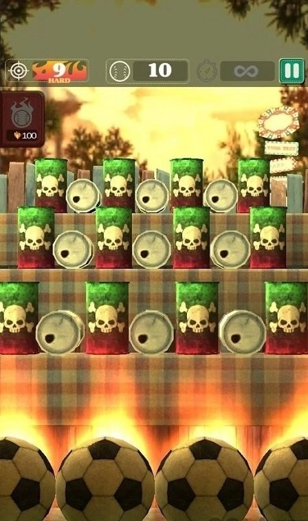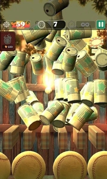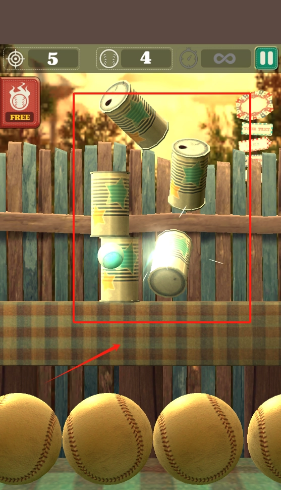 3、界面下方设有四个可供发射的黄球,中间木栅栏前方摆放着五个罐头,点击屏幕即可瞄准并击打目标。上方的图标区域会显示当前已用球数、得分目标等关键数据,右上角则配备了暂停按钮。