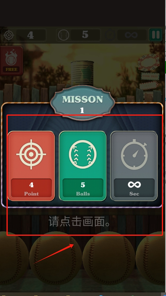 2、这是任务界面,中间三个方框分别对应“获得4分”“使用5个球”“无限时间”的要求。底部提示点击画面,需按照任务要求完成挑战操作。
