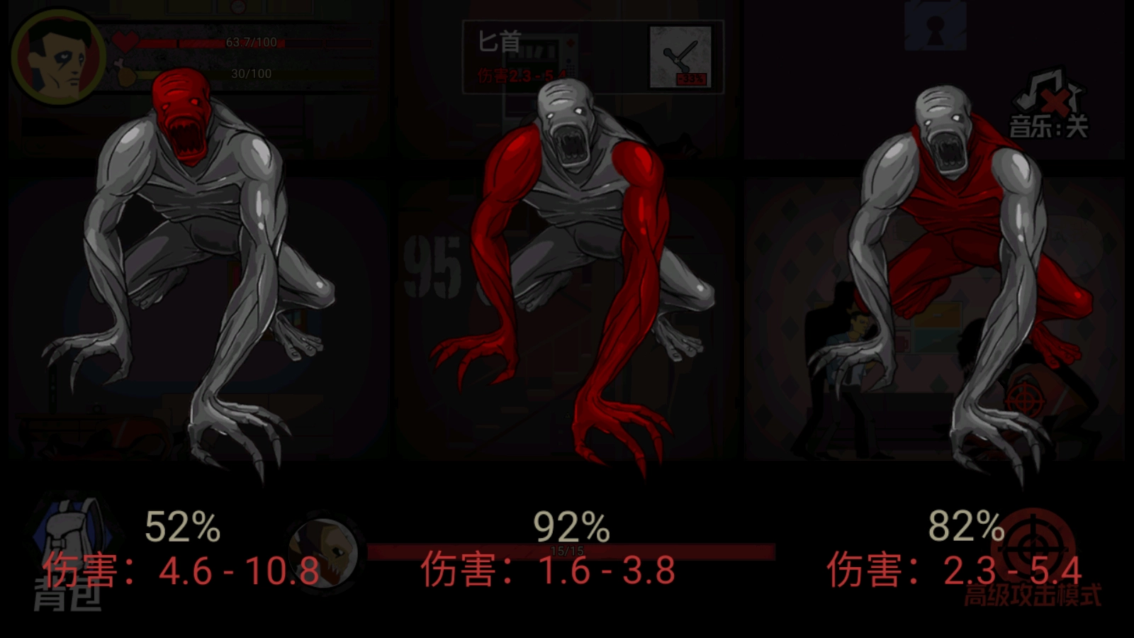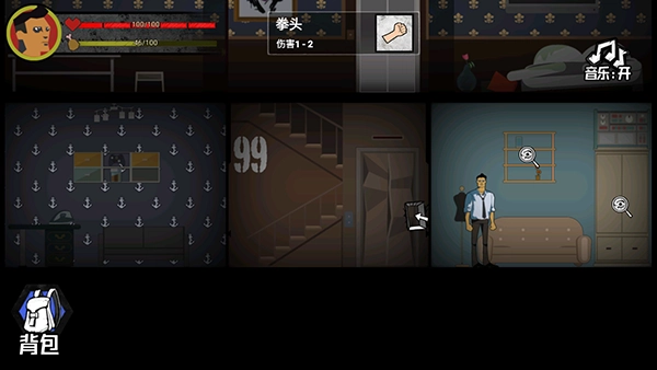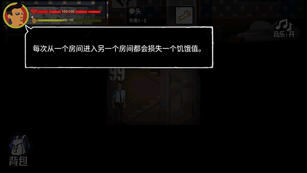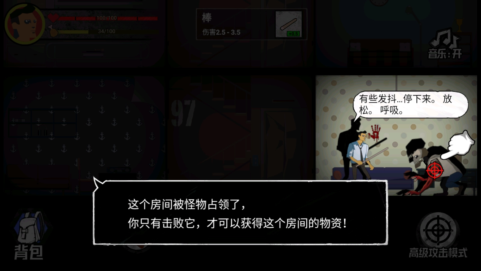 有些房间里藏着怪物,你得用武器把它打倒,才能拿到房间里的物资。