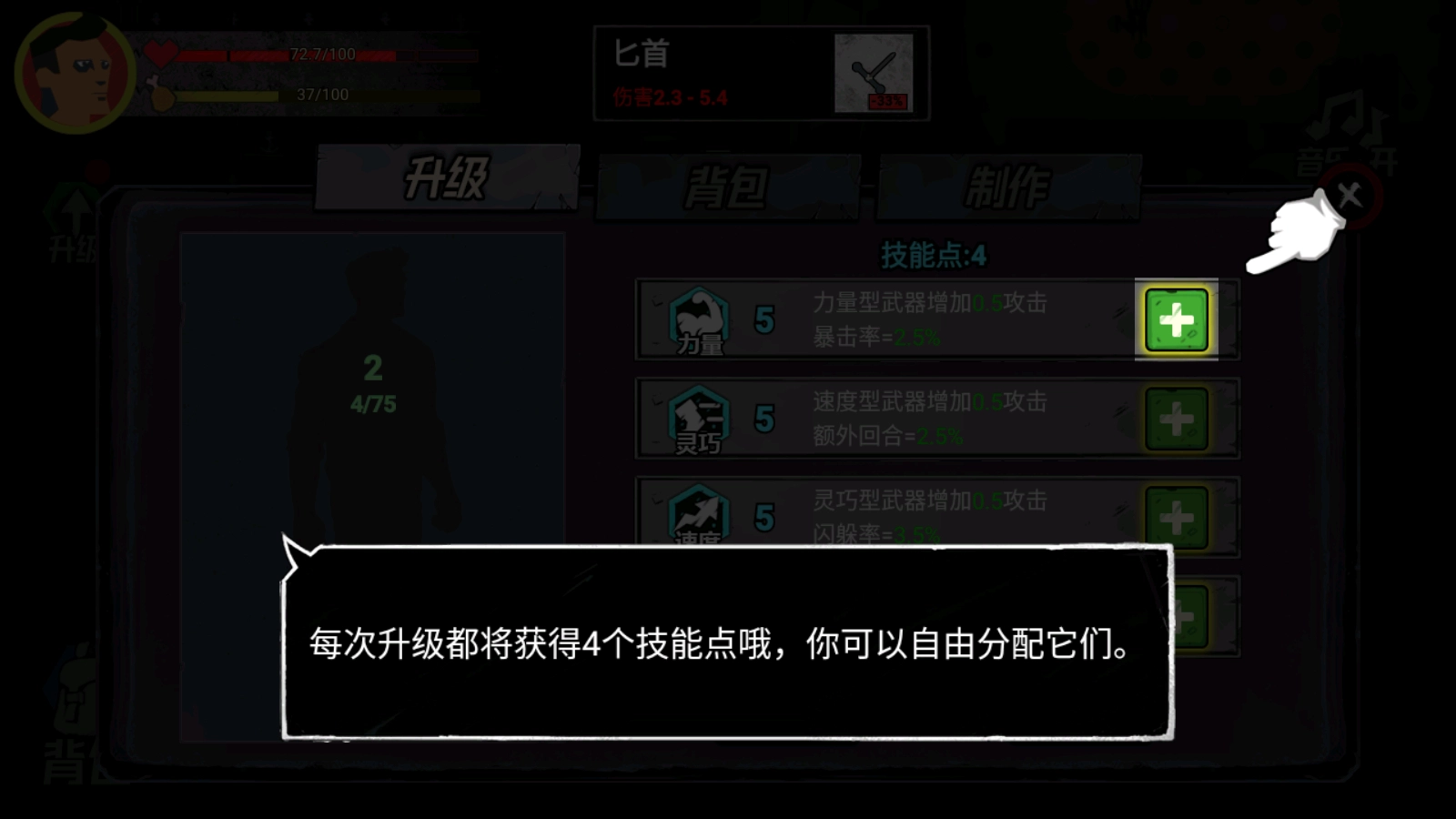 点击背包可以装备武器和使用食物和药品。