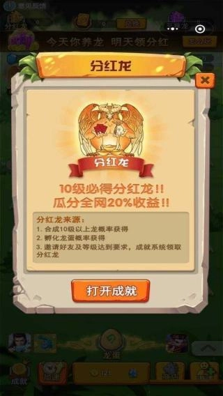 在分红龙的界面中,点击【打开成就】选项,查看获取分红龙所需满足的条件(例如合成10级及以上的龙等),完成对应的任务后,即可参与分红活动。
