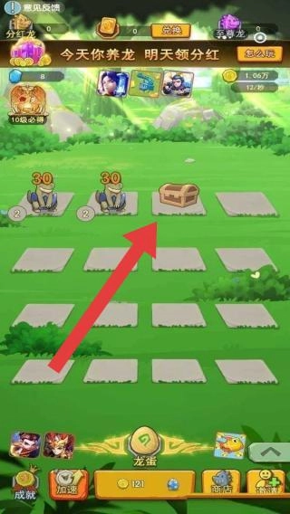 在游戏主场景里,找到箭头所指的宝箱并点击,开启后能获取奖励与资源,这些资源可用于养龙、合成等操作,助力推进游戏进度。