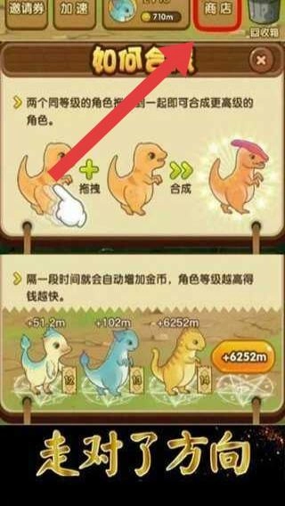 进入商店界面后,按照箭头指示的方向操作,先了解合成机制和收益规则,再运用“将两个相同等级的角色进行合成,从而获得更高等级角色”的玩法,来提升龙的等级。