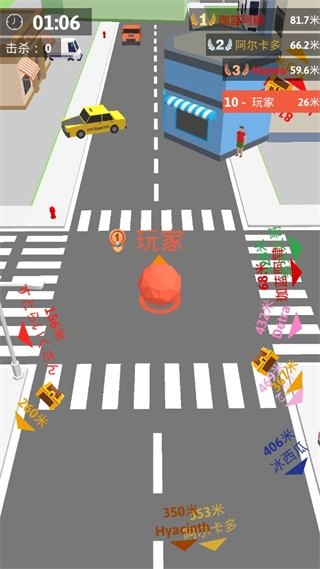 滚动与吞噬:操控你的球在城市里滚动,通过吃掉比自己小的球来让体型变大。要注意,当两个球的大小差不多时会陷入僵持,所以得分析当下局势,选对时机再去吞噬。