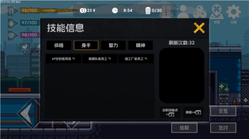 游戏设计了四类关键的能力成长体系,分别关联着角色的体魄、动作协调性、认知水平与心理状态。每类能力的强化都能赋予玩家独特的优势,使其更从容地处理都市生存里的各类挑战。此外,游戏还包含三百余种可解锁的特质技能,这些技能会对角色在收集废弃物品、搜寻公共设施、获取他人资助、参与劳动乃至特殊获取行为中的表现产生影响,助力玩家在城市中找到适合自己的生存策略。