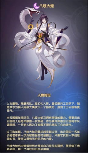 上古魔物,性情残暴,可幻化为人形,曾是共工麾下,因制造洪水为祸人间,被大禹斩去一颗头颅后,遁逃至出云国养伤恢复。出云国本就常年遭受洪灾,而八岐大蛇又身负强大魔力,它便以此要挟出云国百姓,要求每年献上一名少女作为祭品,以此作为保佑该国风调雨顺的条件。起初,百姓为保家园,只得无奈应允。 数年后,八岐大蛇的索求愈发无度。某次献祭之时,出云国一位年长老者向它进言,称若能寻得一本名为《创世录》的奇书,便能获得无穷无尽的力量。八岐大蛇因常被当年大禹斩头的噩梦纠缠,对老者的话深信不疑,遂踏入幻界之境,踏上了寻找《创世录》的征程。