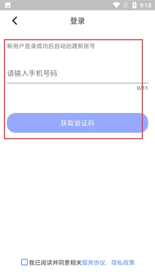 3、进行登录操作时,需先输入手机号码,接着点击【获取验证码】;新用户在登录成功后,系统会自动为其创建新账号。