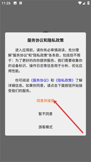 1、当应用启动时会弹出【服务协议和隐私政策】的窗口,请务必仔细阅读相关内容,之后点击【同意并接受】按钮,这样才能进入应用使用各项服务。