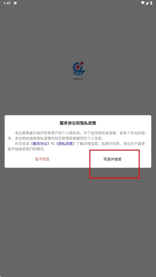 1、点击【同意并接受】功能按钮,以此确认同意服务协议与隐私政策。