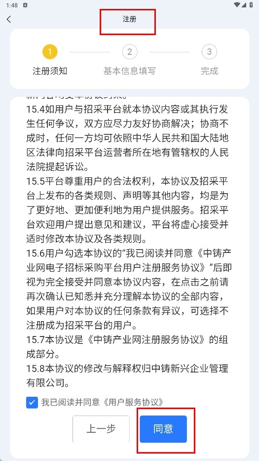 3、点击【注册】功能按钮,进入注册须知页面后勾选同意协议,再点击【同意】功能按钮。