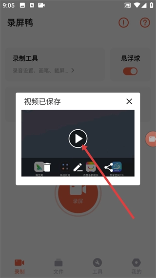 4、录屏结束后,系统会弹出【视频已保存】的提示,点击播放按钮就能查看录制好的视频。